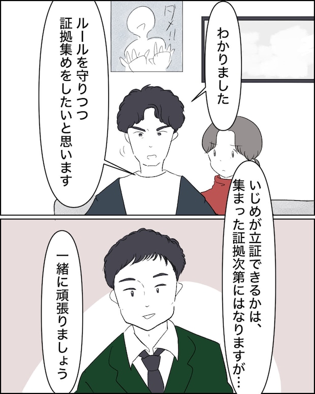 私たちの話をしっかりと聞いてくれた弁護士の先生は、証拠を集めるためのアドバイスをしてくれました。いじめの立証は集めた証拠次第になるけれど、一緒に頑張りましょうと言ってくれたのです。その言葉が私たち夫婦にはどんなに心強かったことか。私たちは、ルールをしっかり守りつつ証拠集めに取り掛かりました。