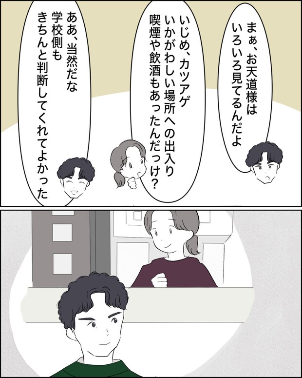 お天道様はいろいろ見ているのだと夫は言いました。私も全くの同意見。中学生のときに風間さんが中心になって歩実をいじめているとわかっても、学校はまともに取り合ってくれませんでした。私は風間さんがうまく先生を言いくるめてウソ泣きした陰ではニヤリと笑っていたところも、歩実とすれ違う時に先生たちにはわからないように悪口を言ったところも見ていたけれど、それを証明することはできませんでした。それ以来、学校に頼らず夫婦で歩実を守ろうと決めたのです。その結果私たち夫婦には、今度こそ風間さんの裏の顔を証明できる自信がありました。風間さんはいじめのみならずカツアゲ、いかがわしい場所への出入り、更には喫煙や飲酒までしていることを私たちは知っているのです。今度こそ、学校が正しい判断をしてくれてよかったと博之は笑いました。