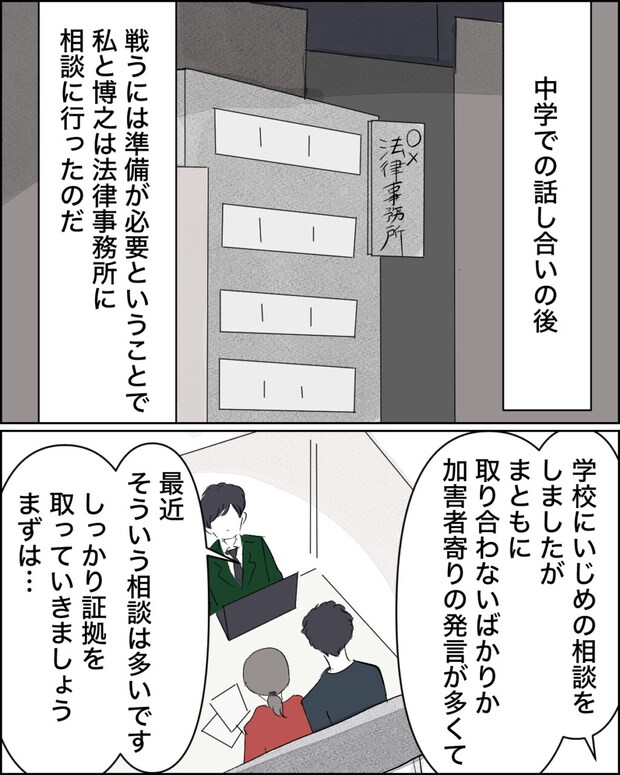 歩実の教科書やノートにひどい落書きをされたり、突き飛ばされて転んで帰ってきて風間さんによるいじめが発覚して中学で話し合いを行った日。いじめに全く真剣に向き合ってくれない学校に絶望した私たちは、自分たちで歩実を守るため、準備が必要だと話し合い、法律事務所に相談に行っていたのでした。