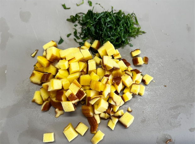 1. 伊達巻を、3mm角ほどのサイコロ状に切る。青じそは千切りにする。