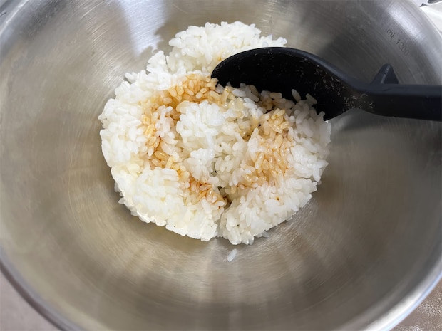 2. 温かいご飯にしょうゆを入れて、軽く混ぜる。