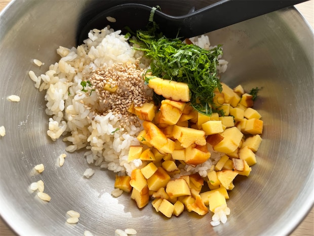 3. 2に伊達巻、青じそ、白いりゴマを混ぜ、2等分にして三角形に握る。