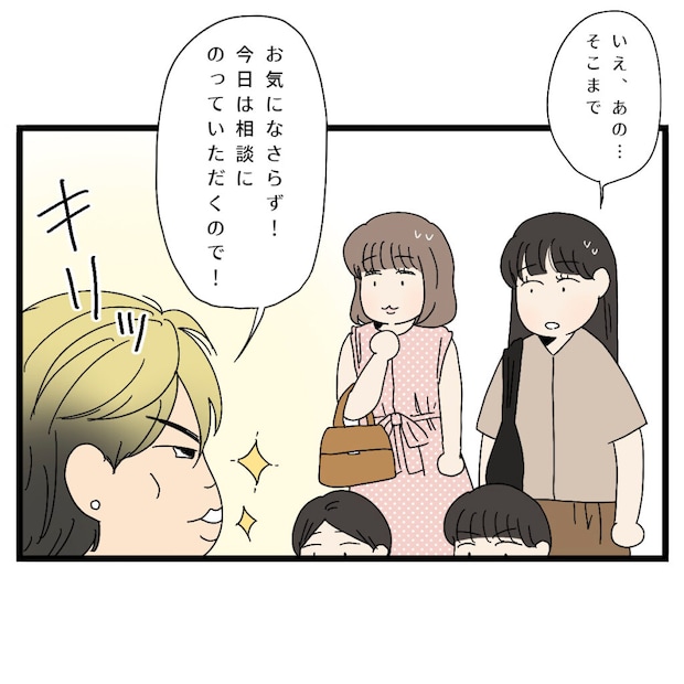 信也さんの口から出た「ごちそうする」という言葉に驚いたママ友たちは、「いえ、あの・・・そこまでしていただかなくても」と遠慮がちに伝えます。しかし信也さんは表情をキリッと引き締めたまま、「お気になさらず!今日は相談に乗っていただくので!」とキッパリ言いました。