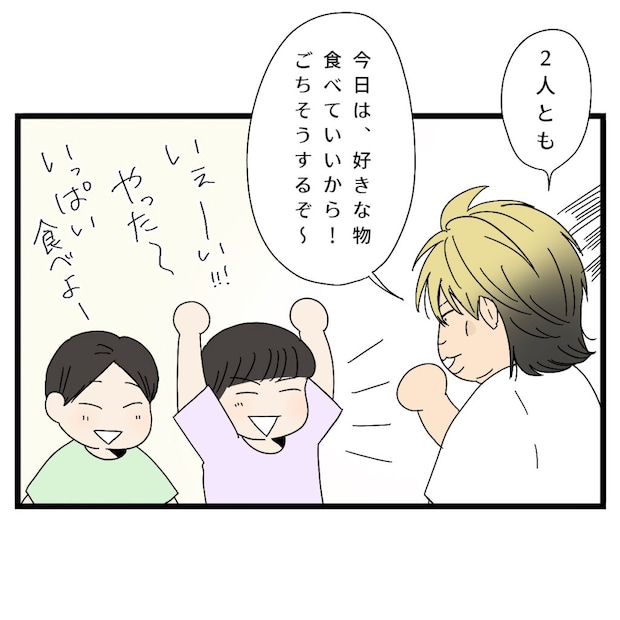 信也さんは身をかがめて、「2人とも、今日は好きなもの食べていいから!ごちそうするぞ~」と子どもたちに声をかけました。すると子どもたちは、「やった~いっぱい食べよ!」と無邪気な声をあげて大喜びします。