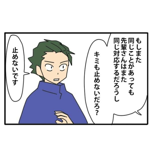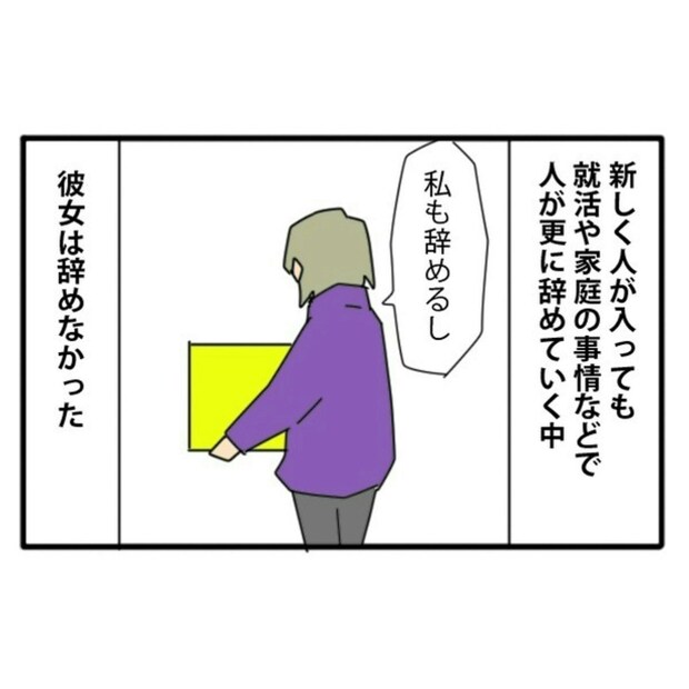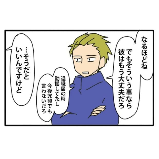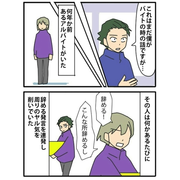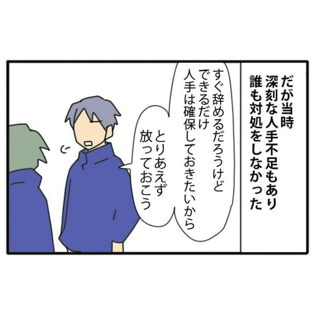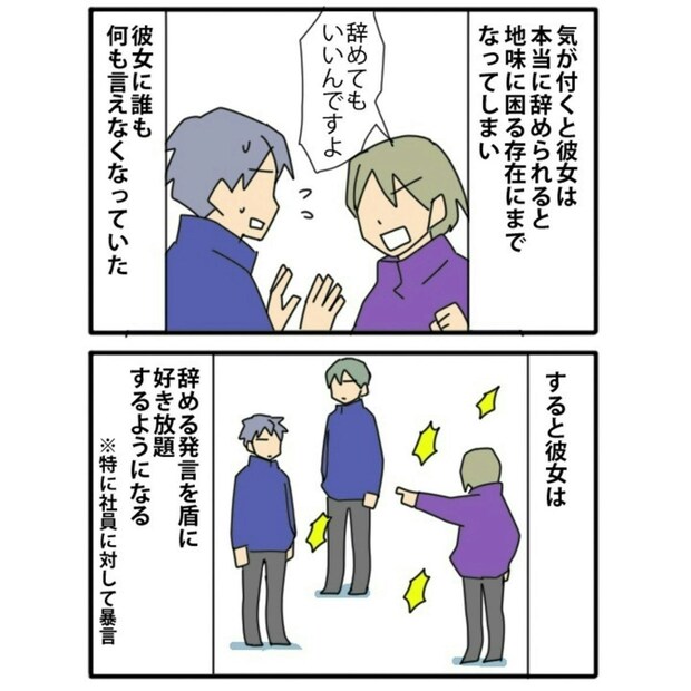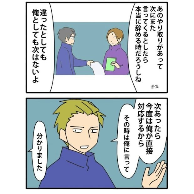 そして、アルバイトの不満の的にされてしまった先輩社員。不満を隠そうともしないアルバイトは、勢いで「辞めてもいい」と脅し文句を言い放します。課長が制止し、その場は収まりますが…。