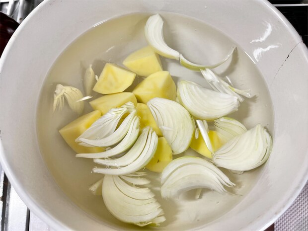 2. 鍋に水を入れて中火にかけ、沸騰してきたらじゃがいもと玉ねぎを加え、2〜3分ほど煮る。