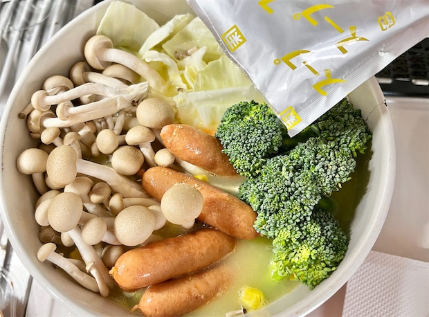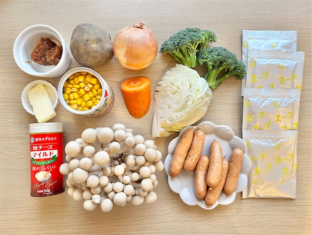 3. キャベツ、にんじん、しめじ、ウインナー、小房に切ったブロッコリーを入れ、コーンスープの素をすべて加えてよく混ぜる。