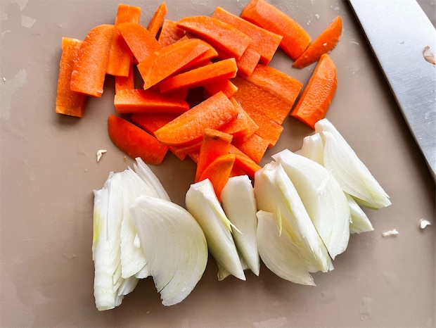 1. じゃがいもは皮を剥き、3~4cmのひと口大に切る。キャベツも同じく、3~4cmの食べやすい大きさに切る。玉ねぎは8等分のくし切りに、にんじんは1.5cm幅の短冊切りにする。しめじは石づきを切り落とし、食べやすい大きさにほぐしておく。