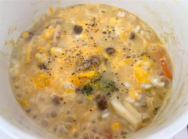 お茶碗1杯ほどのご飯に、ピザ用チーズをひとつかみ。そのままフタをして、弱火で3〜5分ほどコトコト煮込みます。