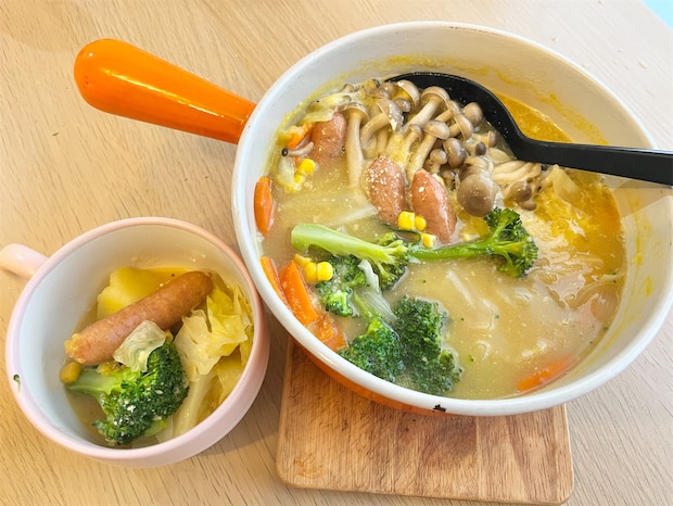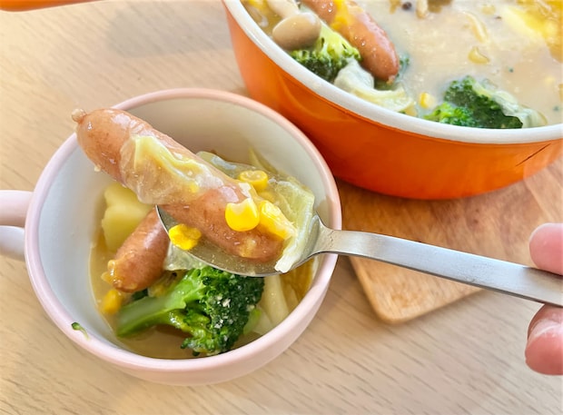 隠し味のみそが効いているので、いつものコーンスープとはちょっと違うような…?味に奥行きがあって、「お鍋」と「シチュー」の良いとこ取りのような満足感がありますよ♪