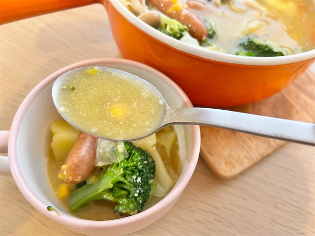 キャベツやしめじはほどよく歯ごたえが残っていて、噛むたびにスープの甘味がじゅわっと染み出します。じゃがいもはホクホク、ウインナーは噛んだ瞬間に肉汁が溢れて、思わず笑っちゃうおいしさです。どの具材もコーンの甘味とよく絡んで、ひと口ごとに幸せな気分に♡