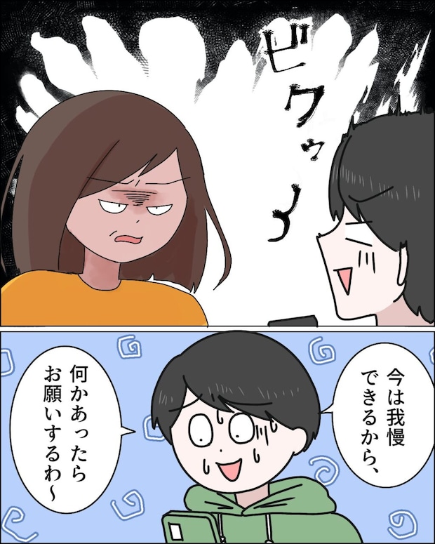 マサオの言葉に腹が立ち、思いっきり睨みつけると、あまりの形相のせいかビクつくマサオ。そして、「今は我慢でこりから、何かあったらお願いするわ~」と慌てながら答えたのでした。