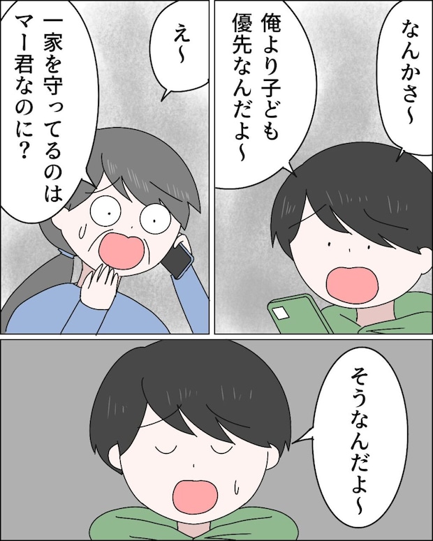 そして、「なんかさ~、俺より子ども優先なんだよ~」と義母に不満を伝えるマサオ。それを聞いて「え~、一家を守ってるのはマー君なのに?」と驚く義母。「そうなんだよ~」と義母に言いつけるマサオは、