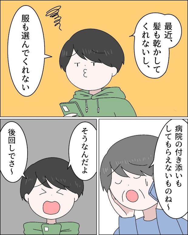 「最近、髪も乾かしてくれないし、服も選んでくれない」と次から次へと私に対する不満を並べるマサオに、「病院の付き添いもしてもらえないものね~」義母がそう言うと、「そうなんだよ。後回しでさ~」とマサオが言うと、
