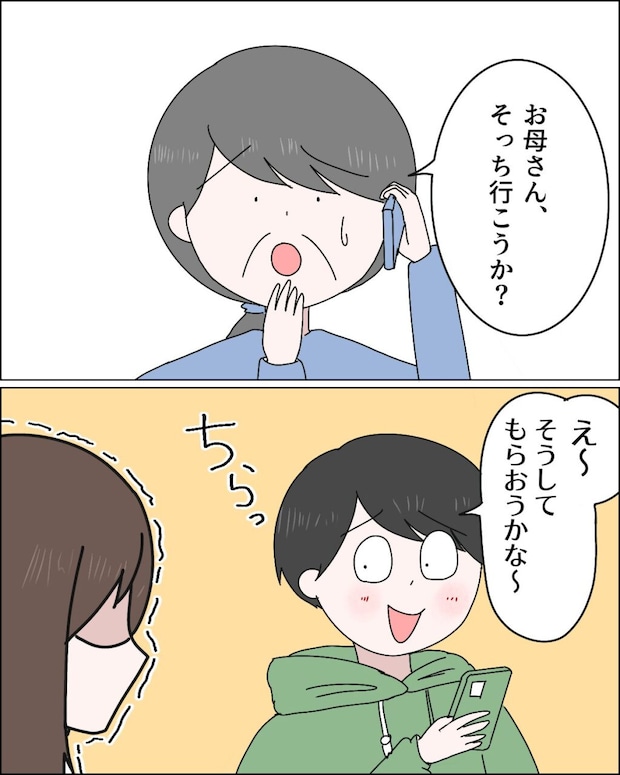 「お母さん、そっち行こうか?」と義母が言うと、「え~、そうしてもらおうかな~」そう答えながら、私も方をちらっとみるのでした。
