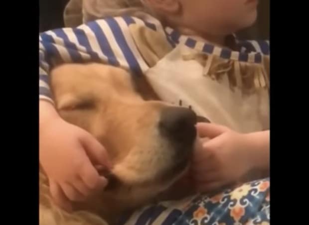 その傍らには、愛犬のゴールデンレトリバーさんが。