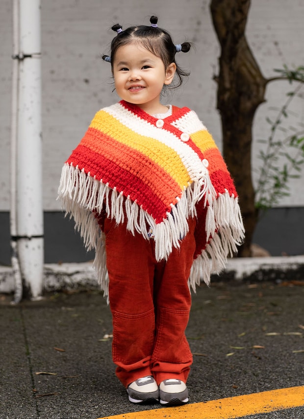 ざっくりニットの質感やレトロな配色、ボヘミアンなフリンジがたまらなく可愛いアウターをさらりとまとった娘ちゃん。ケープのようにふんわり包み込むシルエットが、大人っぽさと可愛らしさを両立。ボトムスは赤みのあるブラウンをチョイスし、暖色でまとめたほっこりウィンタースタイルに。