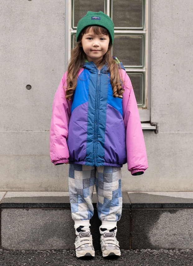 おしゃれ心を満たしてくれる『ボボショーズ』のカラーブロックアウターがお気に入りのデイジーちゃん。存在感のある1枚に、パッチワークが可愛いボトムを合わせて、今っぽいストリートスタイルに。さらに『ノア』のグリーンのビーニーをちょこんとのせれば、ぐっとこなれたムードがプラスされて、冬のストリートガールが完成。