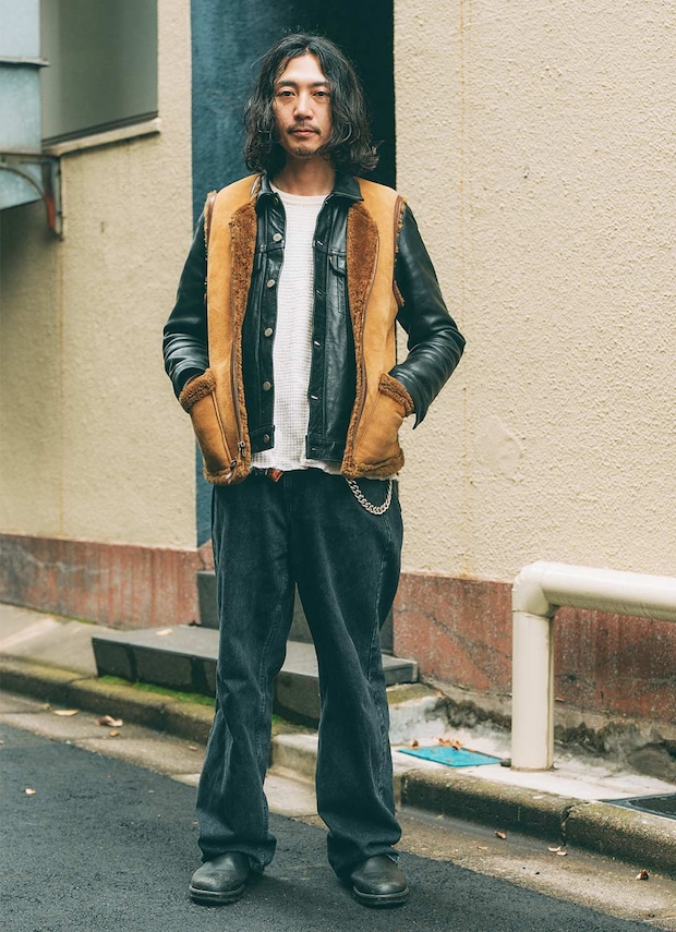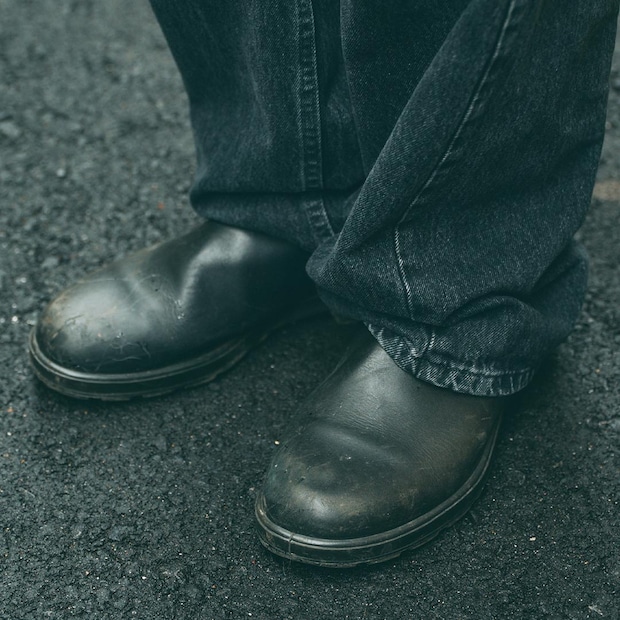 足元は『ブランドストーン』のブラックシューズをオン! ブラックレザーの上質な質感と、ワイドシルエットのボトムスが相性抜群。