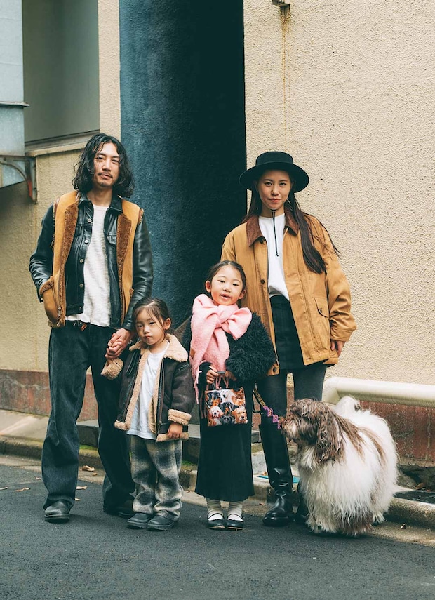 ブラック×ブラウンでつくる冬のファミリーコーデがおしゃれ! ハットやレザーとクールなアイテムを纏いながらも、ハートやピンクで甘さを足して、家族全員で甘辛MIXに仕上げたのがポイント。プチプラを上手く取り入れたスタイリング術は、ぜひ参考にしたい。