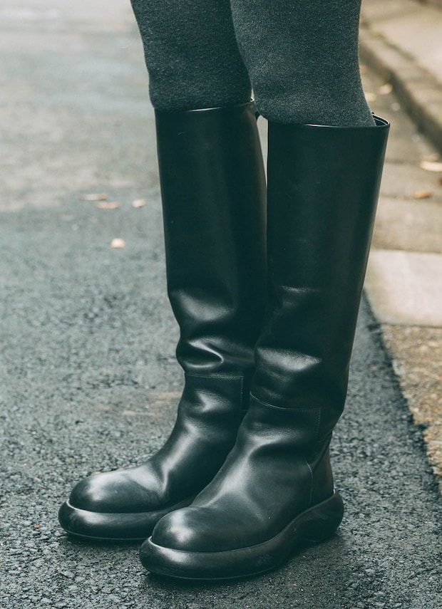 『ジル サンダー』のロングブーツが主役級の存在感。上品なブラックレザーとまろやかなシルエットで視線をキャッチ!