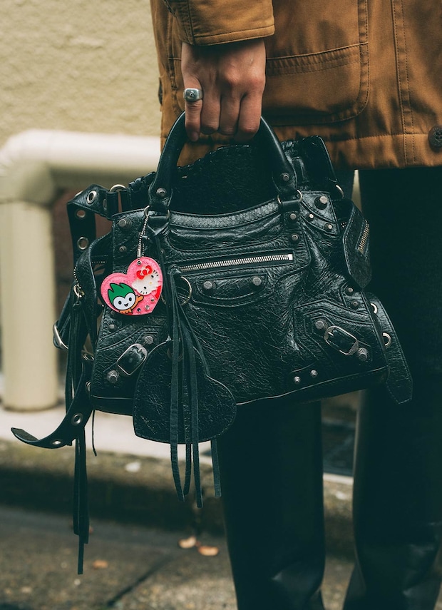 エッジの効いたバッグでスパイスをひとふり。可愛いハートチャームで遊び心を付けたのがグッド!