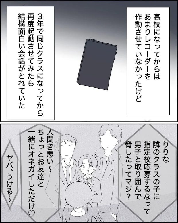 高校に入学してからはいじめも落ち着いたように見えましたが、3年生で風間さんと同じクラスになったのでまたボイスレコーダーを起動させてみると、指定校推薦への応募が風間さんだけだった理由が録音されていました。風間さんは、自分よりも成績の良い子に応募を取り下げるよう圧をかけていました。噂ではカナちゃんから聞いていましたが、その証拠がしっかりとれていたのです。