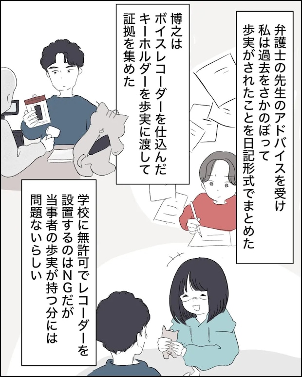 弁護士の先生のアドバイスを受けた博之と私は、歩実がされた数々のいじめを日記形式でまとめていました。さらにいろいろな情報を集めてくれたのは夫が歩実に「お守り」としてプレゼントしていた猫のキーホルダーでした。ぬいぐるみ型のキーホルダーの中に、ボイスレコーダーを仕込んでいたので、学校での生徒たちの会話が筒抜けでした。