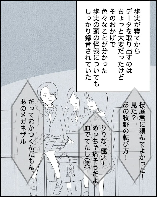 歩実が寝てから2人でデータを取り出すのは少し大変でしたが、ボイスレコーダーのおかげで色々なことが分かりました。歩実が知らない間に、教室内で話す風間さんの声もしっかり録音されていて、球技大会の時に歩の頭にボールが当たる事故の真実が分かったのです。