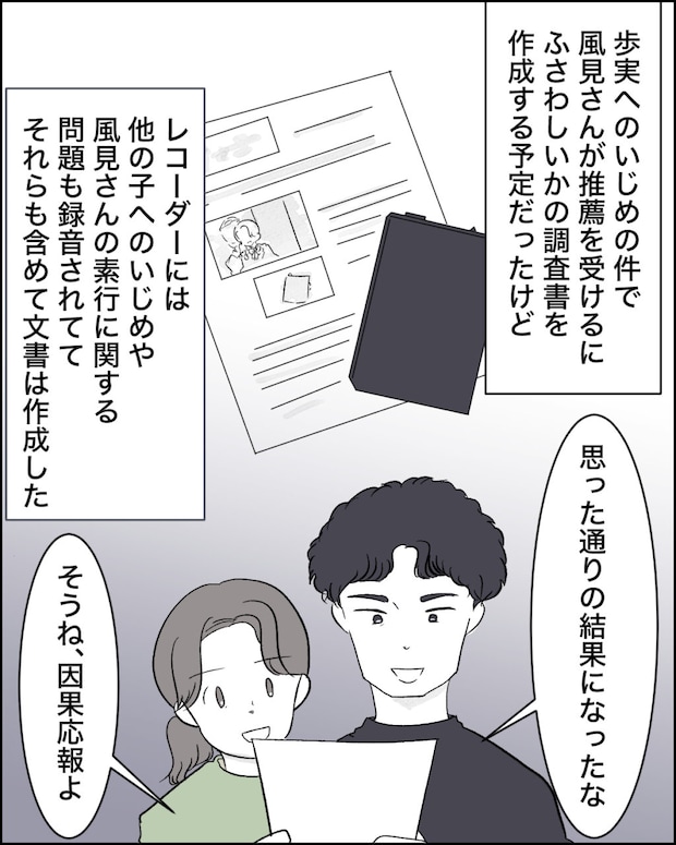 歩実をいじめているのに周りの大人たちを騙して優等生として君臨する風間さんが許せず、推薦を受けるにふさわしいかの調査書を作成するつもりでいましたが、証拠を集めているうちに風間さんは歩実以外にもいじめている子がいたり、学校以外の場所での素行にかなり問題があることが分かり、私はそれらも含めて文書を作成したのです。指定公推薦の取り消しは、私たちにとっては思った通りの結果でした。