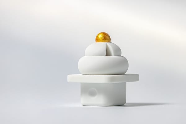 鏡餅は割れていくほど縁起が良いとされる習わしに基づき、あらかじめ割った状態でデザインされているのが特長。手のひらに乗るほどのかわいいサイズ感で、みかんの部分には純金を含んだ色材での塗装が施されている。