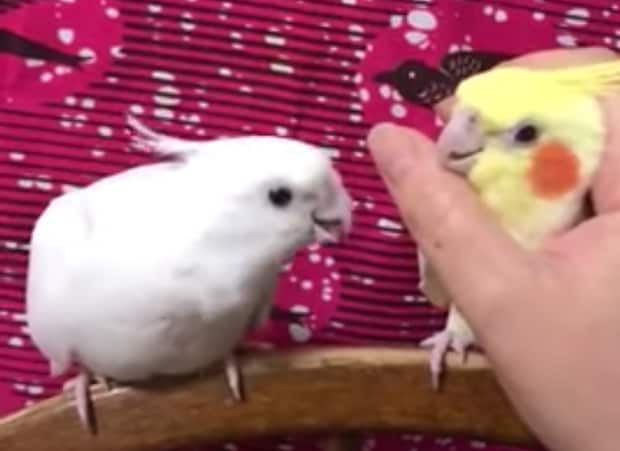 2匹の鳥を愛でている飼い主さん。