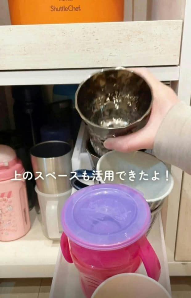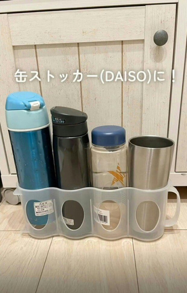 細めの水筒の収納には、缶ストッカーが便利です。
