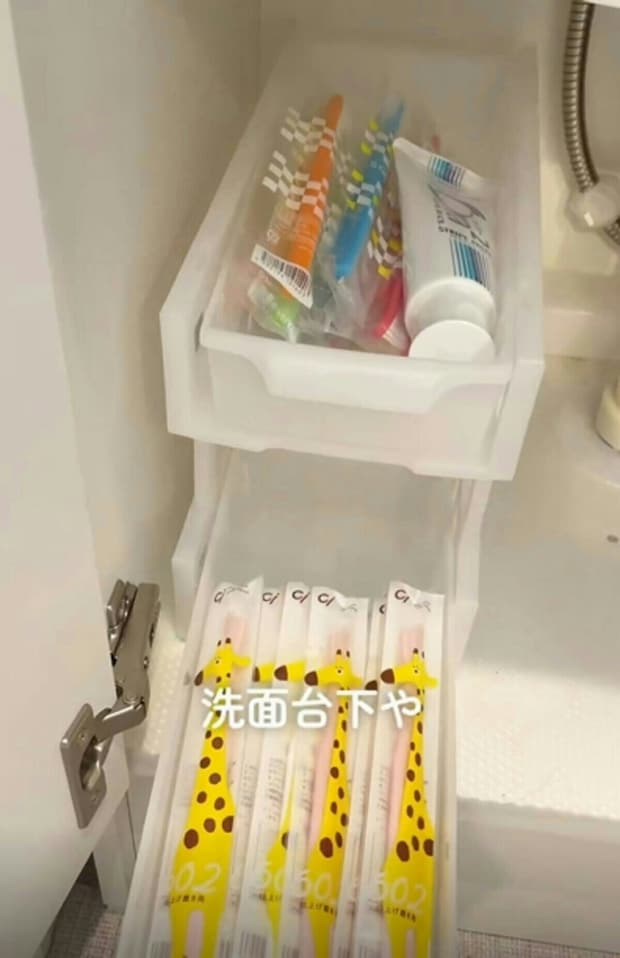 洗面台の下で、歯ブラシや歯磨き粉を置くスペースにしても便利ですよね。