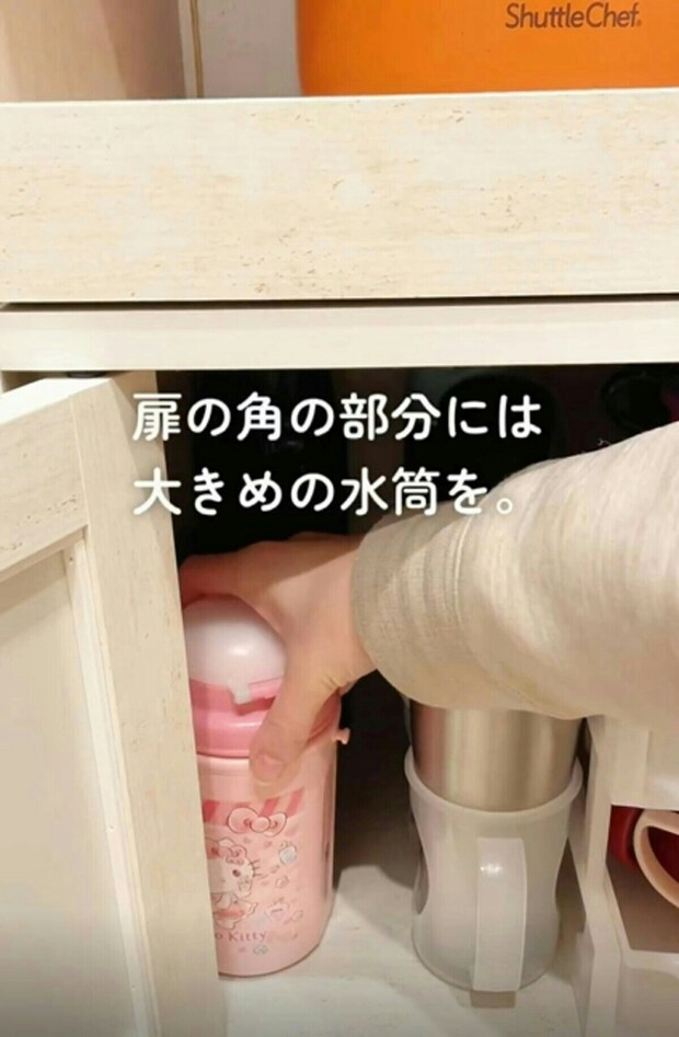 ストッカーにも入らない、大きいサイズの水筒は、扉の角の部分におくと良いですね。
