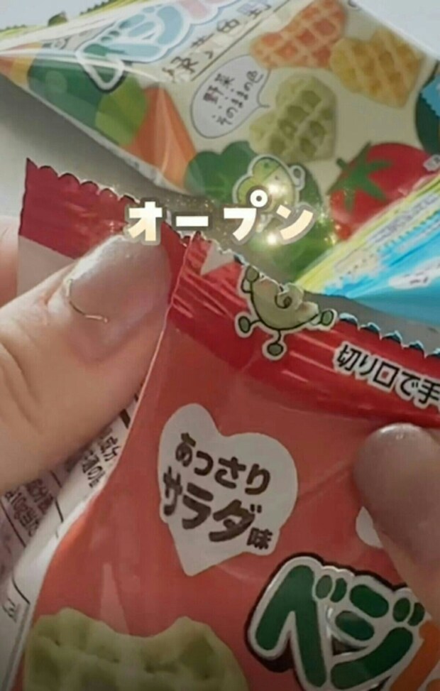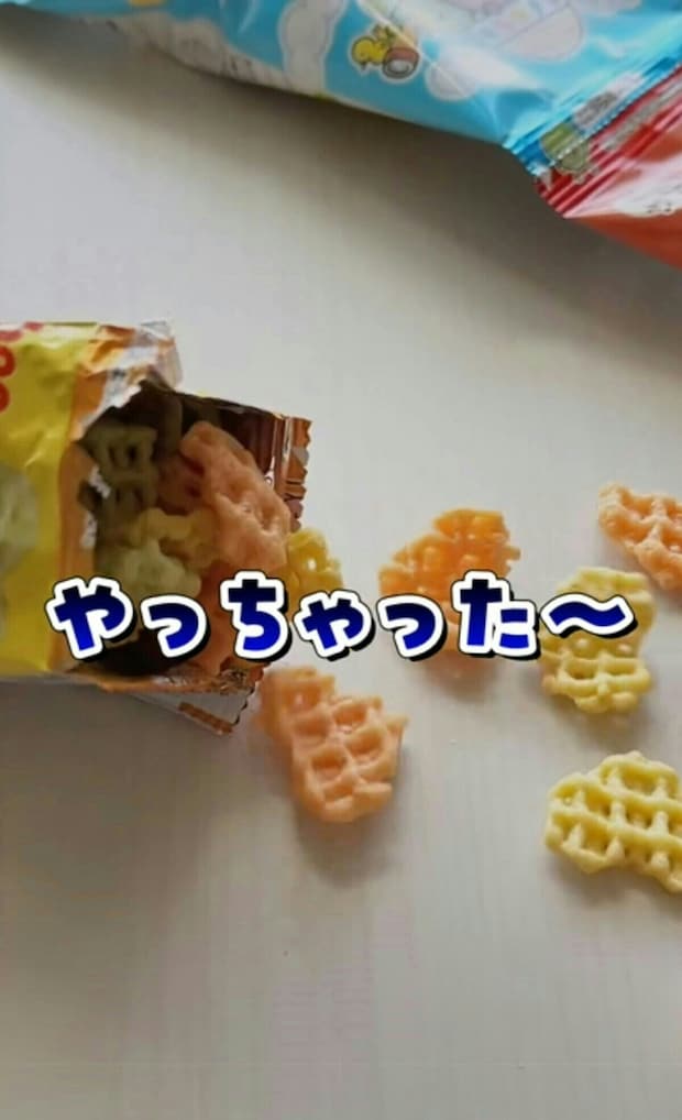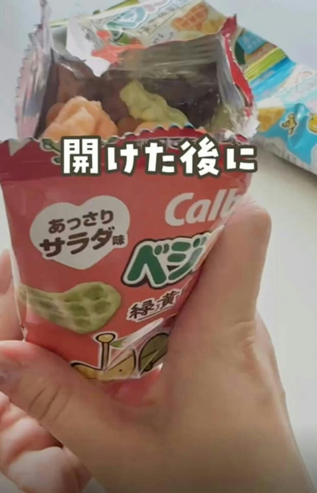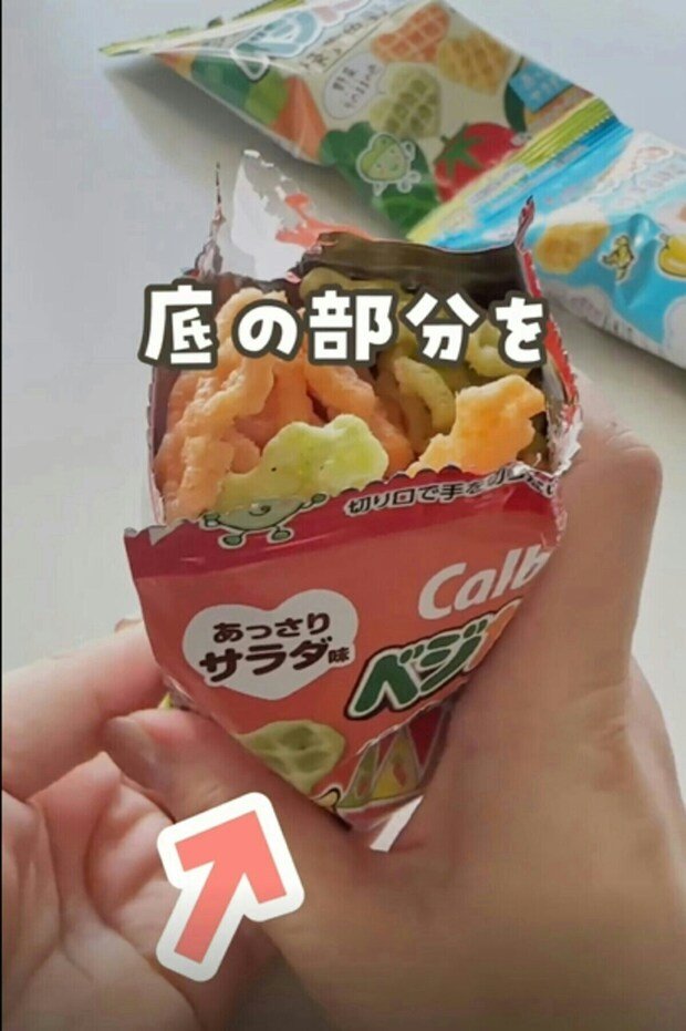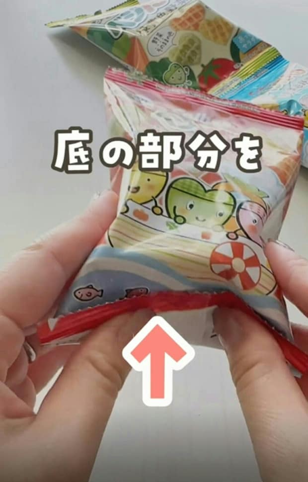 こちらの裏技は、小分けタイプのお菓子から大袋タイプのお菓子まで同じように使えるそう。おやつタイムのプチストレスが解消できて、育児中に助かるアイデアですよね。