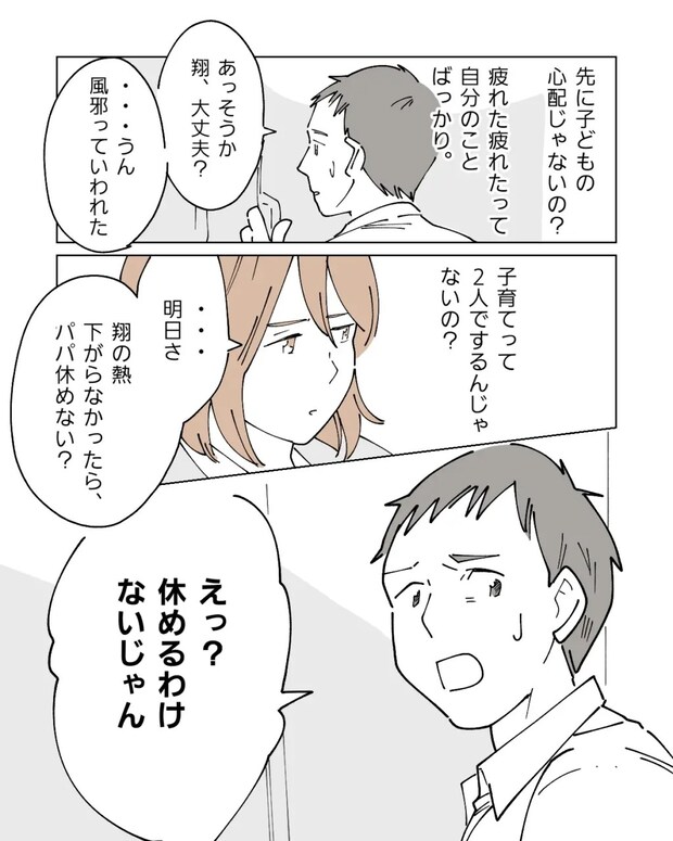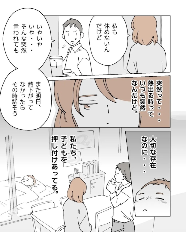 翌日の会議には絶対に出たい私は、翔の熱が下がらなかったら良平が休めないか聞いてみましたが、驚いたように「えっ?休めるわけないじゃん」と答える良平。