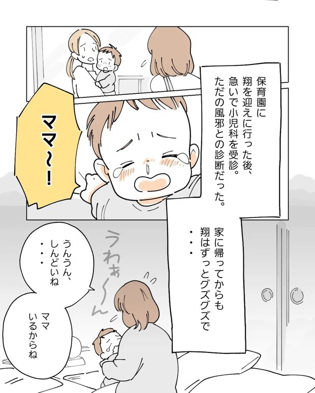 同僚の白井さんに仕事を任せて早退し、急いで保育園へ息子翔を迎えに行った後、その足で小児科を受診。グズる翔から離れられず、帰宅しても何もできない。翔の体調が悪くて保育園から呼び出しがあると、これがいつものパターン。今回はただの風邪との診断で少しホッとしました。