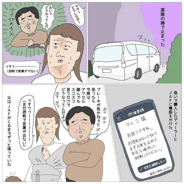 出産後、顔面麻痺の発症や授乳の中止、さらには帰り道での車のトラブルと、立て続けに大変な出来事が重なってしまったみうらまるこさん。心も体も休まる間がない中での出来事に、驚きや不安が大きかったことと思います。運転してくれていたお父さんも、まさかの事態にきっと気が気ではなかったでしょうね。