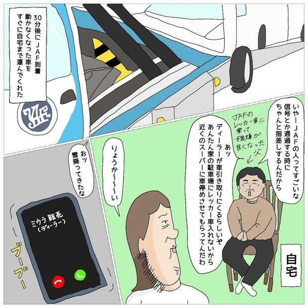 途中で車が止まってしまったので、急遽JAFに電話をかけて助けてもらうことに…。子どもを車に乗せているときにトラブルが起きると肝が冷えますよね。