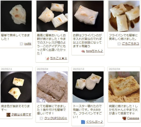 作り方は本当に簡単です。フライパンにお餅を入れて、中火で両面を焼くだけ 。「つくれぽ」(作りましたフォトレポートのこと)にも「簡単に焼けるだけでなく、中までしっかり火が通っていて感動」「片付けがとても楽でした」「網で焼くよりキレイで、中身も飛び出しません」などと喜びのコメントがたくさん届いています。