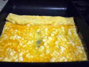 2.熱したフライパンに油を引いて1を均一に流し入れ、弱火で焼きます。半熟になったら、くるくるっと巻きます。これで完成!