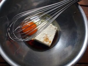 1.卵を割り入れたボウルに豆腐と薄口しょうゆを加え、泡立て器でよく混ぜます。