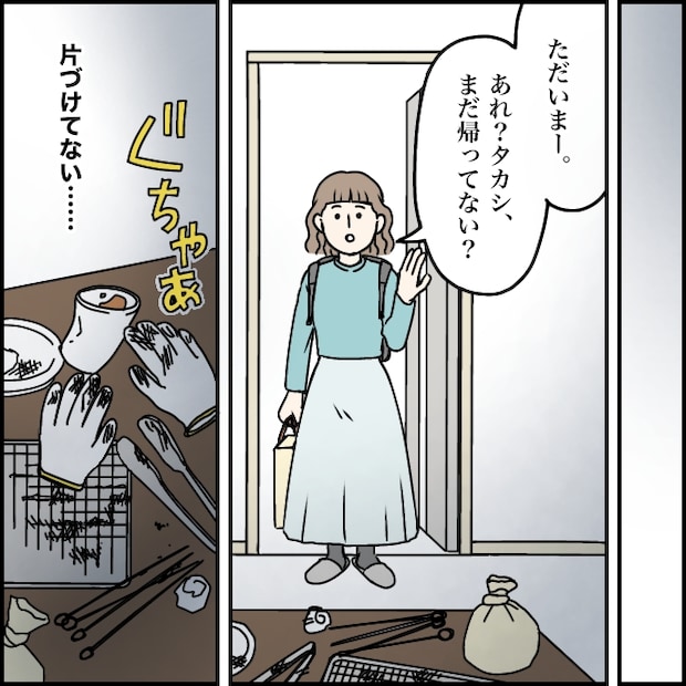 両親学級のあと、私は一度実家に寄ってから自宅に帰ってきました。「ただいまー、あれ?タカシまだ帰ってない?」時刻はもうすっかり夜ですが、タカシはまだ帰って来ていないようです。リビングの机を見ると、使い終わったバーベキューの道具が散乱していました。