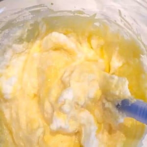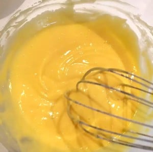 1. ボウルに卵黄、ヨーグルト、砂糖、サラダ油を入れて混ぜ、ふるったベーキングパウダーと強力粉を加えてなめらかになるまで混ぜます。