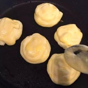 4. 熱したフライパンに生地をスプーンでこんもりとのせ、蓋をして弱火で1分半焼きます。さらに生地をのせ、蓋をして弱火で2分焼きます。
