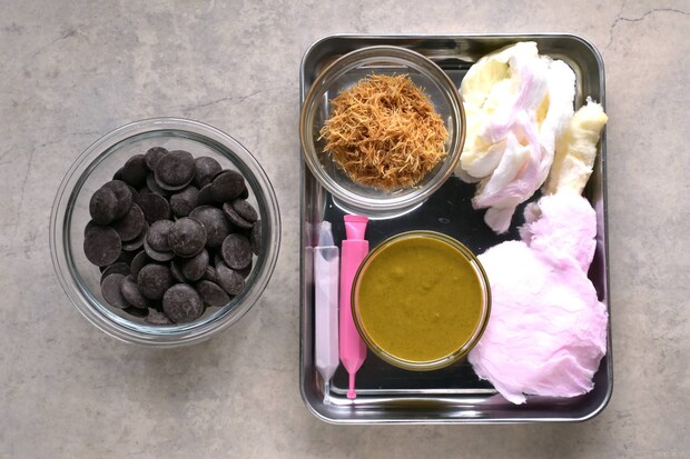「チョコレート+綿あめ」ということでとても甘いため、ピスタチオペーストは無糖のものがおすすめ。富澤商店やオンラインで購入できますよ。