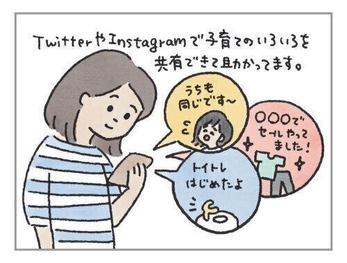 育児で役に立ったツールNo.1をあげるとすれば、私はSNSです・・・!いろんな気持ちを誰かに聞いてほしくて、妊娠時から始めたTwitterやInstagramに、イラストをアップしています。育児の悩みや子どもの成長を共有して、一緒に悩んだり喜んだりできるのは嬉しいし、自分だけじゃないと思うと心強い!Twitterでは同じぐらいの子どものいる方をフォローしていますが、子ども服のセール情報を仕入れて買いに行ってみたり、月齢の近い子がトイトレを始めたと知ってうちも始めなきゃと気付いたり・・・心強いだけじゃなく、ものすごく役に立ってます。