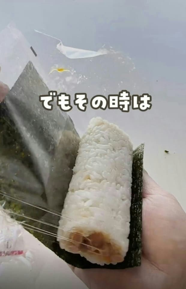 すると、食べやすく持ちやすい状態になります。素手で触れることなく、おにぎりを食べることができます。