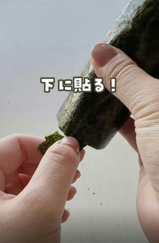ちぎったのりを、のり巻きの下の部分に貼り付けます。